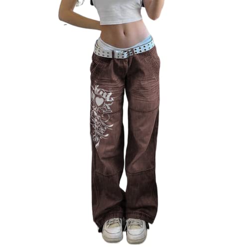 Madger Donna Indie Estetica Jeans Vintage Vita Bassa Baggy Denim Pantaloni Dritti Gamba Larga Pantaloni 90 Hippie Y2K Streetwear, Marrone, L