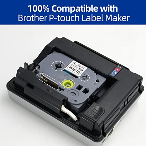 Nastri laminati durevoli: Compatibile con Brohter Ptouch TZe 9mm nastro resistenti all'acqua, alle sostanze chimiche, alla temperatura (da -10 ℃ a 120 ℃), all'abrasione, al grasso e allo sbiadimento. Progettati per superfici lisce e piane come carta da ufficio, cartelle e raccoglitori. Perfetto per uso interno ed esterno