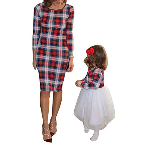 Madre e Figlia Abito Manica Lunga Scozzese Coordinato Famiglia - Donna Vestito Casual Aderente & Ragazze Vestito in Tulle per Festa di Natale Riunione di Famiglia (Rosso-Figlia, 5-6 Anni)