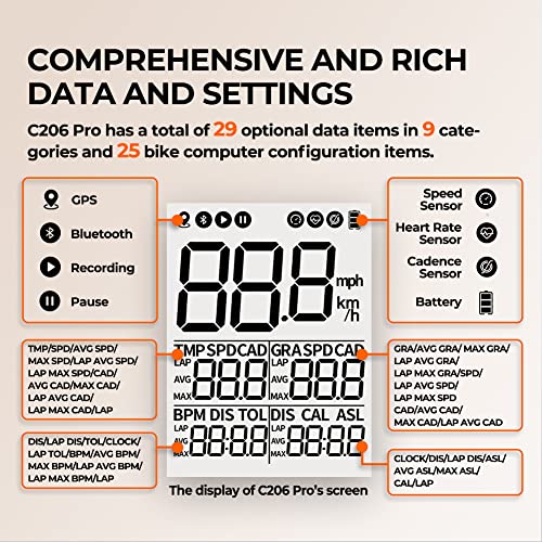 Dati e impostazioni completi e ricchi: C206 Pro ha un totale di 29 elementi di dati opzionali in 9 categorie e 25 elementi di configurazione del ciclocomputer. C206 Pro è stato tra i computer da bici che supportano il maggior numero di dati nella stessa fascia di prezzo, e anche il primo computer da bici nella stessa fascia di prezzo che supporta la funzione di conteggio dei giri. *Acquista per sbloccare la funzione di conteggio dei giri.