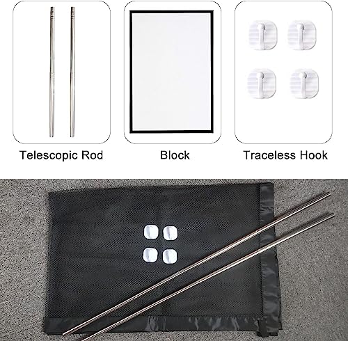 La confezione include un telo, due aste retrattili quattro ganci adesivi, un manuale di istruzioni. In caso di problemi, non esitate a contattarci e faremo del nostro meglio per risolvere il problema il prima possibile.