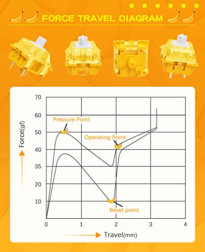 【Interruttore tattile a banana da 40 gf】Con una forza iniziale di 40gf, una forza tattile di 50gf e una corsa totale di 3,3mm, l'interruttore Banana è un interruttore tattile con una posizione tattile elevata. Gli utenti inizieranno a sentire l'urto tattile a 0,5 mm con un feedback continuo fino a 2 mm. È più tattile e persino migliore dell'interruttore blu oceano e viola lavanda, in modo da poter sentire pienamente il piacere della digitazione e del gioco.