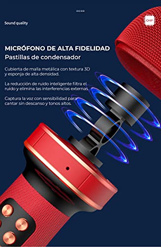 MICROFONO: una maggiore qualità del suono e più effetti vocali ed effetto ECO. Le pastiglie condensatore e la copertura in rete metallica con texture 3D e spugna ad alta densità garantiscono un suono privo di rumore. Cattura la tua voce con sensibilità e senza riposo. Attiva la modalità ECO per un suono più coinvolgente e registra i tuoi brani aggiungendo una scheda SD o cablata sul tuo cellulare o computer.