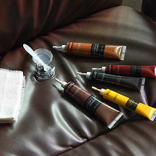 【Kit di riparazione in pelle tutto pronto】 Contiene 10 composti di colore miscelabili (marrone chiaro, noce, cioccolato usati frequentemente sono 40 ml/tubo e crema, marrone chiaro, bordeaux, nero, blu, rosso e giallo sono 20 ml/tubo). Dispone inoltre di 2 tessuti di supporto, 1 barattolo di miscelazione, 1 pennello e 1 spatola come strumenti ausiliari.