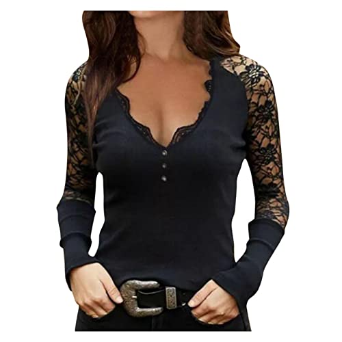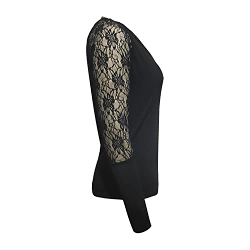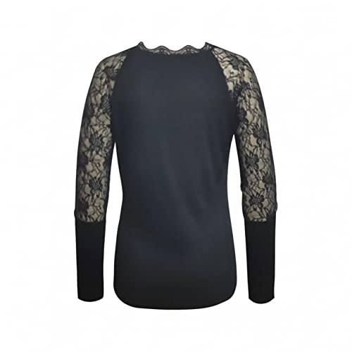 Maglia da donna a maniche lunghe con pizzo floreale su spalle e braccia, tinta unita, con scollo a V, 03#nero., S
