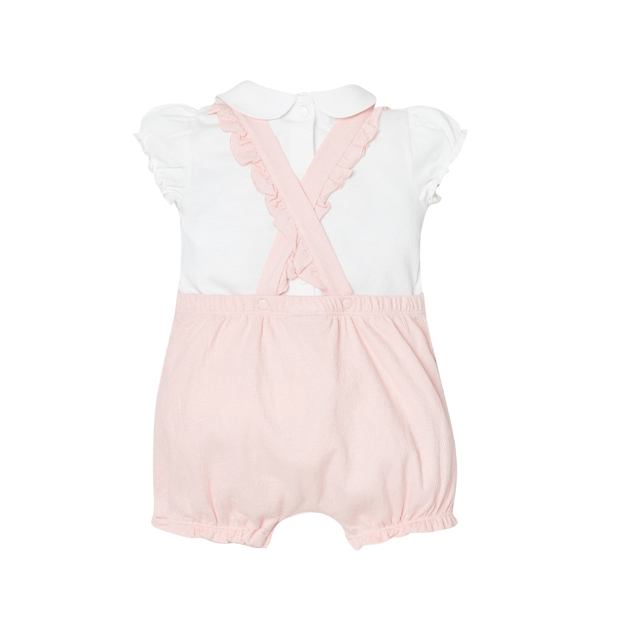Dettagli del prodotto: Set di maglietta e salopette T-shirt con colletto e bottoni a pressione sul retro Maniche corte a sbuffo Salopette con tasche applicate sul davanti Bretelle con ruches incrociate sul retro Materiale e istruzioni per la cura: Materiale: top 100% cotone, salopette: 94% cotone, 4% poliestere, 2% elastan Lavabile fino a 40 °C Non adatto all'asciugatrice
