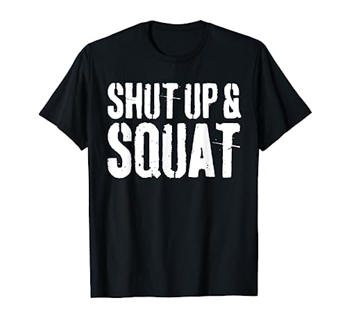 Umorismo Detto Formazione Zitto E Squat Tee. Completa la tua collezione di calistenica, atletica, fitness, bodybuilding, accessori di buona forma per lui (cappello, bracciale, fascino, portachiavi, tazza da caffè, adesivo, uniforme, pin, abbigliamento) con questa maglietta