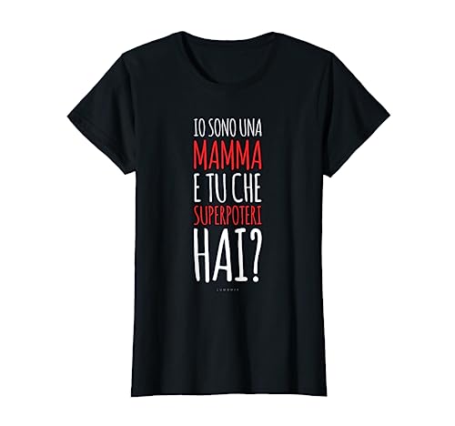Shirt design: Io sono una mamma e tu che superpoteri hai?. Magliette a manica corta con scritte divertenti e frasi ironiche e simpatiche per la mamma. Magliette per donna e ragazza. Marca LUMOMIX.