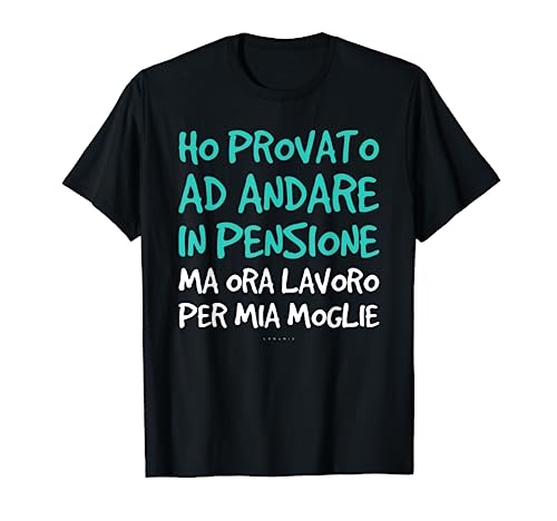 Shirt design: Ho provato ad andare in pensione ma ora lavoro per mia moglie. Magliette a manica corta con scritte divertenti e frasi ironiche e simpatiche sulla pensione. Magliette per uomo e ragazzo. Marca LUMOMIX.
