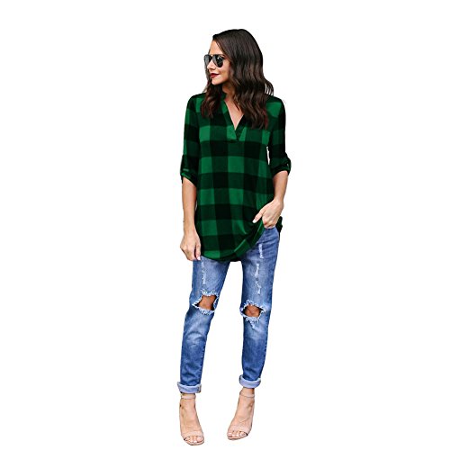 Magliette a Quadri Moda T Shirt Manica Tre Quarti Roll Up Camicie e Bluse Donna Tunica Scollo V Felpa Tumblr Autunno Pullover Sweatshirt Sportive Casual Maglia Asimmetrica Tartan Top Ragazza Estivi