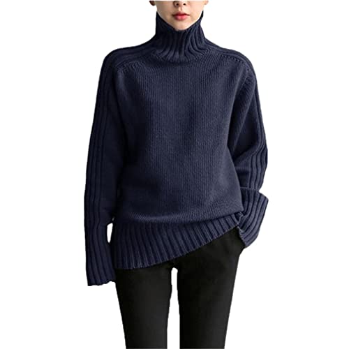 Maglione caldo di base del pullover del collo alto allentato per le donne molle del maglione solido della maglia superiore, Blu, Taglia unica