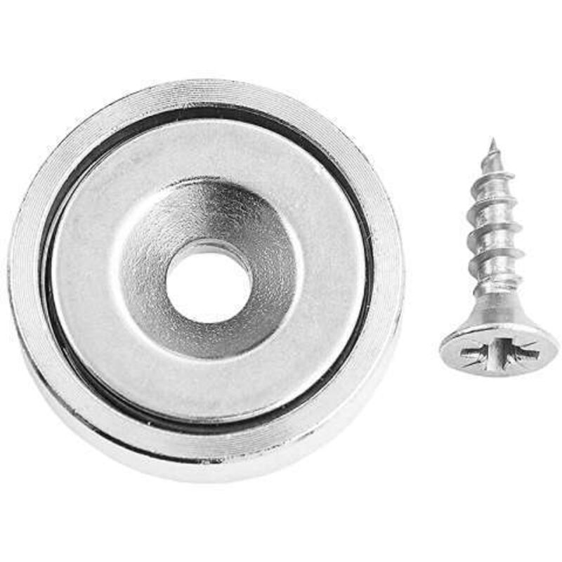 Magnete tondo con foro e vite al Neodimio N35 compatto e potente con forzamagnetica da 10,5kg. Le possibilità di utilizzo sono svariate, forniti conviti truciolari testa piana svasata in acciaio Inox A2 - AISI 304, resistenti a ruggine e corrosione.
