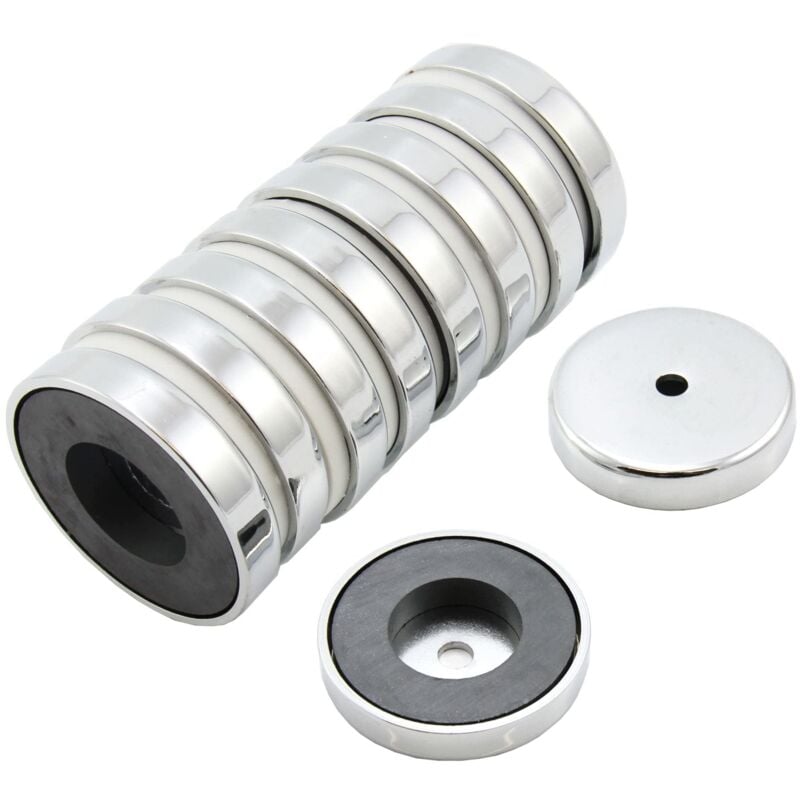 10 pezzi. 50 mm di diametro x 10 mm di spessore con un foro passante piatto di 8,5 mm di diametro per una vite o un bullone. Ogni magnete può supportare 15,8 kg di trazione verticalmente dalla faccia magnetica quando è a contatto con una superficie in acciaio dolce di uguale spessore. Guscio in acciaio cromato. Può essere fissato in posizione con viti a testa cilindrica da 8 mm di diametro. Eccezionale rapporto qualità-prezzo, questi magneti in ferrite sono costituiti da un magnete in ferrite affondato in un guscio di acciaio, il che significa che il polo nord si trova al centro della faccia magnetica e il polo sud è sul bordo esterno intorno ad esso. Il vaso in acciaio aumenta la forza adesiva dei magneti dando loro una forte tenuta per le loro dimensioni. Un ulteriore vantaggio dei magneti è che sono resistenti a scheggiature o crepe a seguito di un impatto costante con una superficie in acciaio. Questi magneti sono dotati di un avvertimento di sicurezza, poiché sono così potenti
