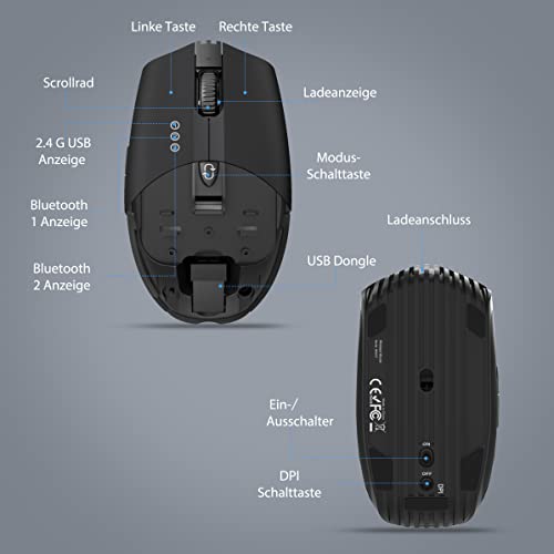 2,4 G + BT1 + BT2: Il mouse wireless ha 2 canali Bluetooth e 1 c USB, può essere collegato contemporaneamente a 3 dispositivi, premendo il pulsante di commutazione della modalità si può facilmente cambiare la connessione tra loro. Veloce e pratico.