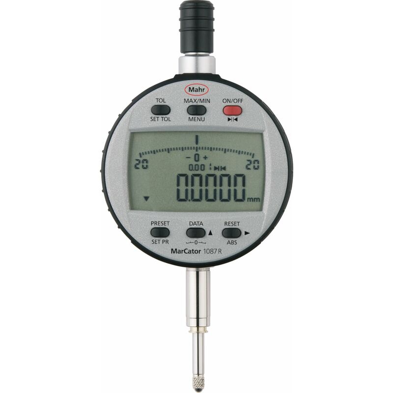 DescrizioneEsecuzione:Comparatore digitale con visualizzazione molto grande delle cifre (11 mm) e visualizzazione della tolleranza. Display analogico supplementare a barra con indicazione dei limiti di tolleranza.Funzione Absolut: Azzeramento possibile in tutte le posizioni, senza perdere il riferimento.Funzioni di misura dinamiche (MAX/MIN): Per i controlli di rotondità e di planarità o per la ricerca del flesso.Fattore regolabile con visualizzazione sul display.Le singole funzioni possono essere bloccate direttamente dal comparatore. Le impostazioni e i valori memorizzati (fattore, preset, tolleranze) non vanno persi neanche in caso di sostituzione della batteria.Funzione:IP42: protezione contro la caduta di gocce d'acqua con inclinazione massima di 15° rispetto alla normale posizione d'uso, nonché protezione contro la penetrazione di corpi estranei con ⌀ > 1 mm;