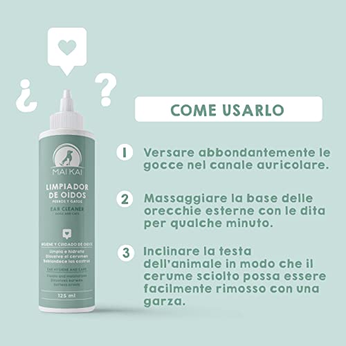 MAIKAI Pulisci Orecchie - per Cani e Gatti (125 ml) - Detergente Auricolare per Pulizia Orecchie: elimina Acari, prurito e otite - Pulitore Orecchie equilibrato Che rimuove Sporco, croste e cerume
