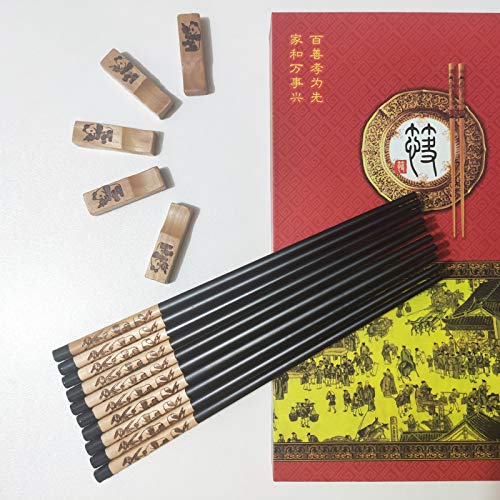 Mainiusi - Set di bacchette in legno con poggio, riutilizzabili, in legno naturale, con supporto per panda da 5 paia di stoviglie tradizionali cinesi per principianti, con confezione regalo