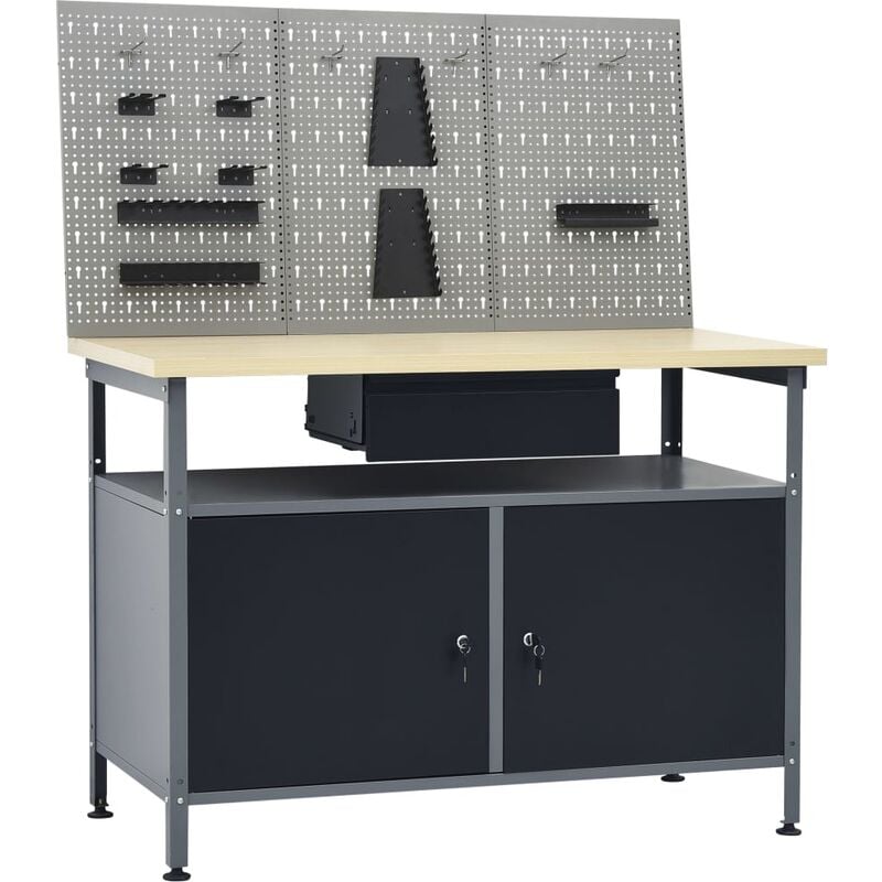 Questo prodotto combina 1 banco da lavoro e 3 pannelli a parete e rappresenta una soluzione comoda per riporre gli attrezzi nell'officina o nel garage. Il banco da lavoro robusto, si distingue per l'ampio spazio di stoccaggio e la capacità di carico di 300 kg. Questo banco da lavoro ha uno scompartimento aperto dotato di un cassetto, che consente di organizzare bene strumenti, parti e accessori come viti, chiodi e nastro adesivo. Ci sono 2 ripiani e un ampio scomparto con 2 ante bloccabili, per alloggiare facilmente trapani, tamburi per cavi e smerigliatrici. Inoltre, i piedi sono regolabili in altezza. Questo banco da lavoro è realizzato in acciaio e truciolato di alta qualità, il che lo rende estremamente robusto, resistente e facile da pulire. È facile da montare. I pannelli per utensili sono realizzati in acciaio solido per sostenere il peso di vari strumenti, come trapani, pinze, cacciaviti e chiavi. I pannelli sono dotati di fori per fissare gli strumenti in modo facile e