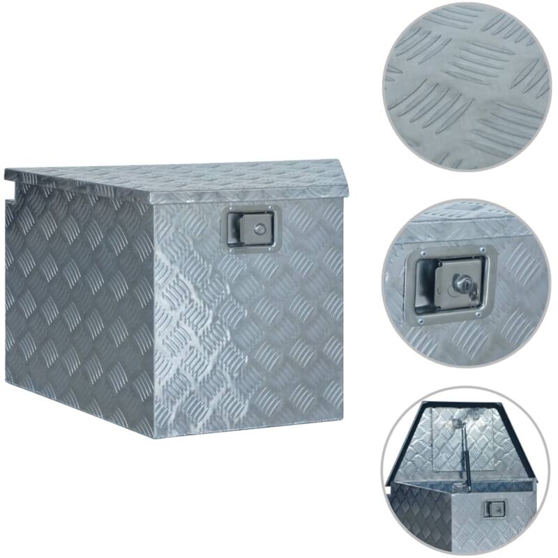 Grazie al suo design leggero e compatto, la nostra cassa in alluminio multiuso è la scelta ideale per l'imballaggio, lo stoccaggio e il trasporto. Può essere riposta all'interno di un veicolo, di un garage oppure può essere utilizzata in campeggio. Realizzata in lamiera di alluminio ondulato di alta qualità la cassa è resistente alla ruggine e solida. La cassa ha un interno spazioso dove riporre utensili, accessori o attrezzature ed è dotata di un sistema di chiusura per una maggiore sicurezza (1 chiave inclusa). Colore: Argento Materiale: Alluminio Dimensioni: 737/381 x 410 x 460 mm (L x P x A) Triangolo Peso: 6,35 kg Con sistema di chiusura (1 chiave inclusa) È resistente alla ruggine e facile da pulire