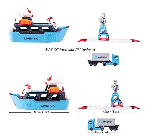 Set completo: oltre alla nave ed alla stazione portuale con gru, il set comprende anche un modello di camion a licenza ufficiale Maersk in metallo pressofuso con un container da 20 piedi