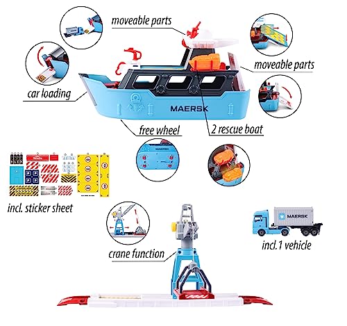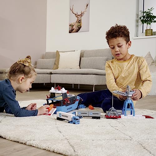 Majorette - Creatix Nave Container MAERSK, 212050039, 3 anni, playset con nave e piattaforma di carico con gru, incluso un camion con container, con due barche di salvataggio, misura 52 cm
