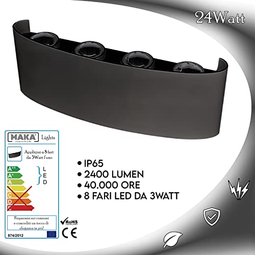 Maka Applique da Esterno Interno Led da Parete 24W Lampade da Muro Plafoniera Moderna Luci Up Down 2400 Lumen Ip65 Impermeabile Fascio Luce Durata Illuminazione 40 mila ore (Nero, 6500K)