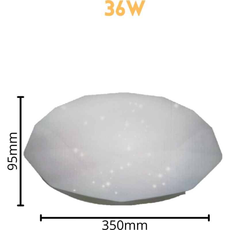 Plafoniera LED con potenza a scelta tra 18, 24 e 36W. Forma circolare, a diamante, con parte posteriore realizzata in metallo e copertura in materiale plastico di colore bianco. Il suo particolare design ricorda un cielo stellato, ideale per aggiungere un tocco di autenticità e luminosità ad ogni tuo ambiente. Inoltre, puoi scegliere la tonalità di luce desiderata tra fredda (6500K) e naturale (4000K). Facile da montare, grazie alla connessione tramite morsetti a vite (inclusi nella confezione). Ideale per soggiorno, cucina, sala da pranzo, home living e ogni altro spazio interno desiderato. Specifiche 18W - Flusso luminoso: 1620LM - Fascio luminoso: 180° - IP Protezione: IP20 - Peso: 0.45 Kg - Dimensioni: 80 x 230mm Specifiche 24W - Flusso luminoso: 2160LM - Fascio luminoso: 180° - IP Protezione: IP20 - Peso: 0.5 Kg - Dimensioni: 87 x 300mm Specifiche 36W - Flusso luminoso: 3240LM - Fascio luminoso: 180° - IP Protezione: IP20 - Peso: 0.6 Kg - Dimensioni: 95 x 350mm Contenuto della
