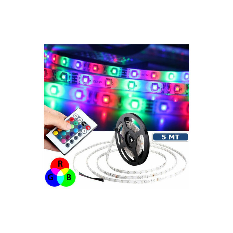 Striscia led RGB completo di telecomando e alimentatore con DC12V e DC24V, potenza 14W e 16W, lunga 5mt e tagliabile ogni 3 led sul segno di taglio. Strip munita di adesivo per una facile installazione interna ed esterna grazie all'impermeabilità IP44. 12 colori regolabili in intensità e 4 modalità dinamiche, accensione e spegnimento tutto tramite telecomando, accontentando le diverse esigenze di illuminazione. Specifiche Modello Strip led RGB 12V Potenza 14w Lumen 720lm/mt Tensione DC12V Quantità led 60 led/mt Tipo led Smd 5050 Grado protezione IP65 Taglio Ogni 3 led Accessori inclusi Telecomando+trasformatore Giochi di luce 4 Dimmerabile Si Colori luce 12 Intensità luce Regolabile Uso Interno-Esterno Dimensioni (mm) Larghezza 10 mm Lunghezza 5000 mm Contenuto della confezione Striscia led rgb 5 metri Alimentatore Telecomando (batterie non incluse)