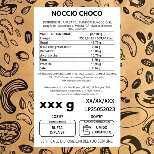 Makadamia - Mix di Frutta Secca e Cioccolato Fondente 500 g - Noccio Choco - Anacardi Tostati (200 g), “Cioccolato di Modica IGP” Fondente al 70%, Mandorle Grezze, Nocciole Pelate Tostate- 500g