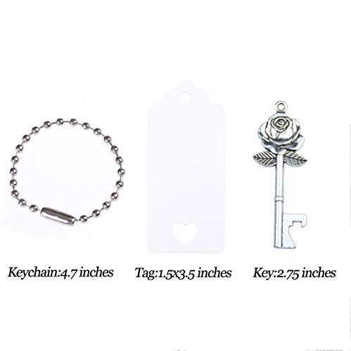 Makhry 52pcs Rosa a Forma di Fiore Apribottiglie Chiave Vintage Bomboniere per Ospiti Set Regalo Souvenir con Scorta Grazie Tag e Portachiavi (Antico Argento)
