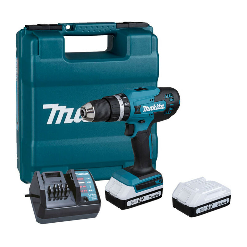 Trapano a percussione compatto e leggero a 2 velocità Mandrino autoserrante 13 mm ad anello singolo Regolazione precisa della coppia in 16 posizioni + posizione di foratura + posizione di foratura a martello 2 velocità con ingranaggi in metallo per forare e avvitare in modo affidabile ed efficiente Migliore controllo grazie al freno elettrico, la macchina si arresta quando si rilascia il grilletto Inversione del senso di rotazione Ergonomia Soft Grip per una migliore presa access_077 - Custodia sintetica 195423-6 - Caricabatterie DC18WA 2 x 198186-3 - Batteria BL1815G (Li-ion 18 V - 1,5 Ah - stampa speciale) 784637-8 - Punta doppia per cacciavite PH2/flat. Tensione 18 V Batteria Capacità della batteria 1,5 Ah Chimica della batteria agli ioni di litio Tempo medio di ricarica 70 minuti. Numero di batterie in dotazione 2 Velocità lineare o periferica Numero di velocità 2 Dieta Velocità a vuoto V1 da 0 a 400 giri/min. Velocità a vuoto V2 da 0 a 1400 giri/min. Tasso Strike V1 da 0 a 6000