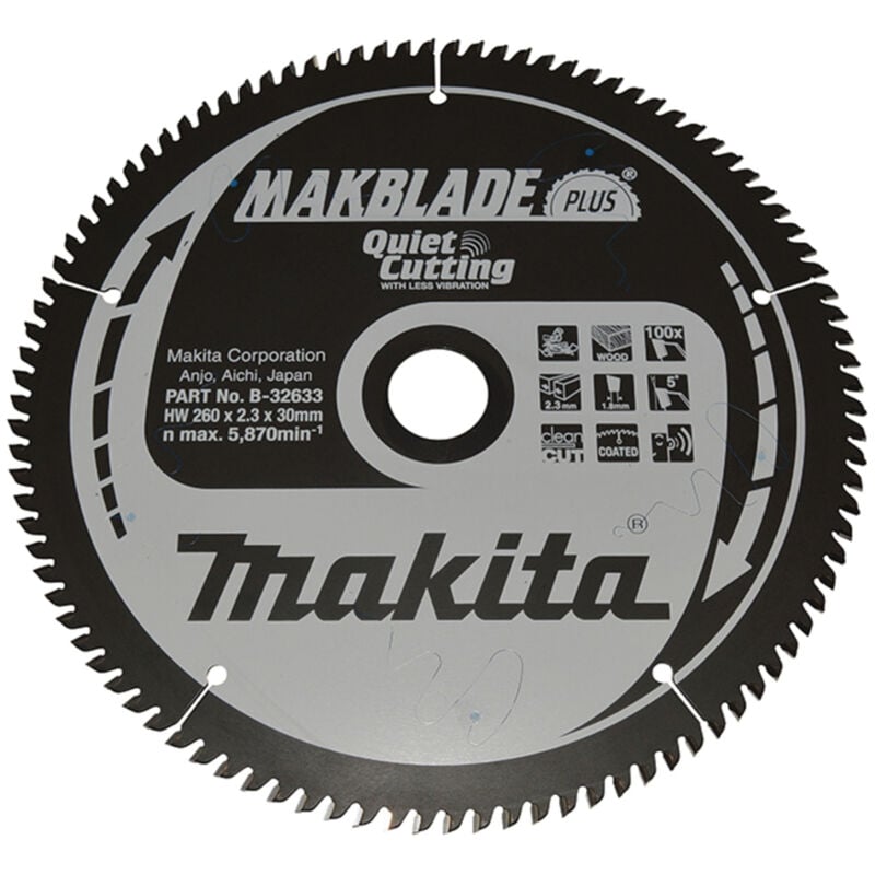 La lama TCT silenziata per troncatrici 260x30 per legno Makita B-32633 Makblade Plus è un accessorio per utensili da taglio indicato per la realizzazione di tagli silenziosi ed estramemente puliti e rifiniti.La serie Makblade Plus offre infatti lame di altissima qualità, studiate e realizzate per ridurre al minimo le vibrazioni e la rumorosità durante la lavorazione, fornendo così anche una maggior stabilità e risultati ancor più precisi e puliti. Oltre ad allungare la durata della vita dell'accessorio, il particolare design consente all'operatore di tagliare con minore sforzo. Queste lame vengono trattate con resine e rivestimenti che ne riducono l'attrito permettendo così di ridurre notevolmente la rumorosità durante il taglio, assicurando un ambiente di lavoro più silenzioso e meno stressante per l'operatore.La Makita B-32633 è realizzata con 100 denti in carburo di tungsteno e con diametro pari a 260 mm e foro da 30 mm.Le immagini sono illustrative e potrebbero