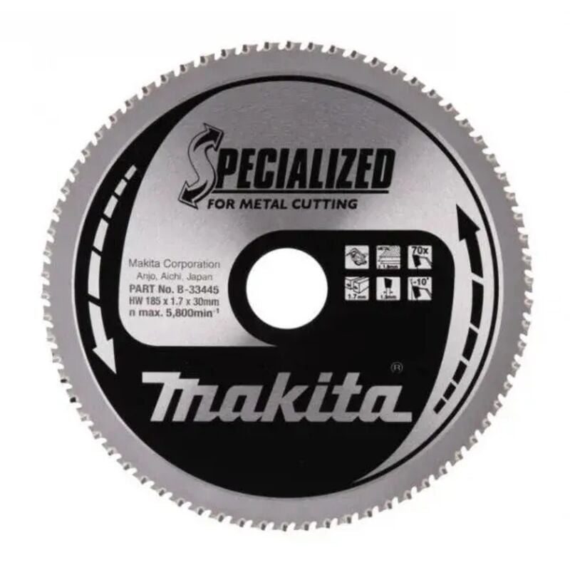 La lama per seghe circolari 185x30 mm per lamiera Makita B-33445 Specialized è un accessorio per elettroutensili da taglio, progettato per ottimizzare il più possibile le operazioni di taglio professionale dell'acciaio.Le lame della serie Specialized per taglio metallo sono perfette per l'acciaio dolce, profilati, tubi e barre, grazie alla composizione speciale dei denti in carburo.Il taglio risulta rapido e pulito fino a 30 volte più veloce rispetto alle lavorazioni con lame di tipo abrasivo. Inoltre, il design apposito di queste lame Specialized garantisce una ridotta produzione di calore per un miglior ciclo di vita dell'accessorio, oltre ad una ridotta produzione di scintille e polveri durante l'utilizzo della lama.La lama Specialized Makita B-33445 misura 185 mm di diametro con foro da 30 mm e 70 denti, indicata per il taglio di metallo con seghe circolari.Le immagini sono illustrative e potrebbero non rappresentare fedelmente il prodotto finale. Tipologia