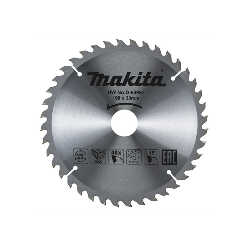 MAKITA D-64967 Disco TCT 190/30/40D Legno Vantaggi per l'utente Tagli in legni teneri. Progettato per seghe Makita seghe circolari e altri produttori. Specifiche Angolo di inclinazione del dente - 15 - ° Diametro - 190 - mm Diametro interno del disco - 30 - mm Spessore - 2,2 - Spessore - 1,4 - mm Numero di denti - 40