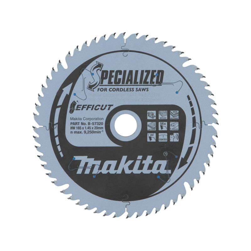 Per legno, MDF, laminato Ø Lama 165 mm Spessore Chiodi 1,45 mm Spessore Lama 1 mm Ø Foro 20 mm Numero di denti 56 Ang. crot. 23°. Modulo ATAFR Velocità massima 9.250 giri/min.