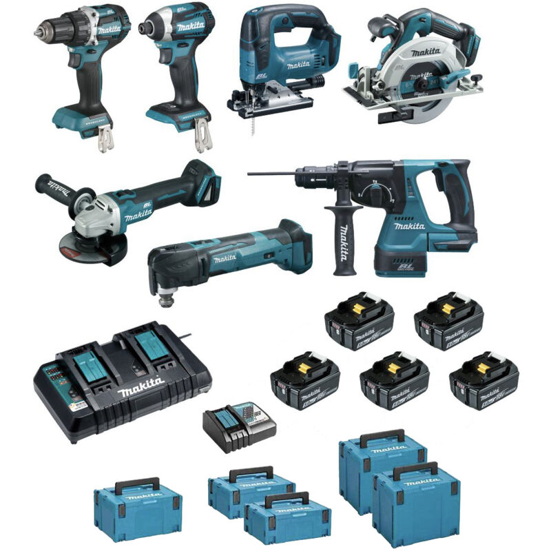 Dettagli: DDF484 - Trapano avvitatore Ø 13 mm Trapano avvitatore a motore Brushless, rapido (2000 giri/min) e compatto (182 mm) per lavori pesanti. Motore BL: potente, maggiore capacità della macchina, maggiore efficienza e ridotta manutenzione rispetto ai motori convenzionali. Robusto grazie al carter dell'ingranaggio in alluminio e al pignone interamente in metallo. Tecnologia XPT per limitare le infiltrazioni di acqua e polvere Doppia illuminazione a LED integrata per un lavoro più facile in luoghi bui DGA506 - Smerigliatrice Ø 125 mm Smerigliatrice a batteria da 125 mm, potente, performante e maneggevole. Protezione antiritorno kick-back: il motore si mette in sicurezza se rileva una caduta improvvisa della velocità. Freno elettrico e sistema anti riavvio per una maggiore sicurezza. Controllo automatico della velocità in base al carico applicato per una rettifica ottimale. Motore senza carboncini: potente, performante, compatto e leggero DHR243 - Perforatore-scalpellatore SDS-Plus