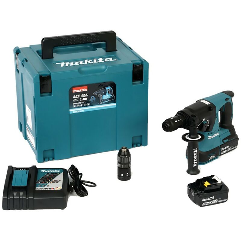 A batteria. Dotato di 3 funzioni: rotazione, rotazione+percussione e solo percussione. Impugnatura ergonomica con softgrip. Interruttore di reversibilità, mandrino a sgancio rapido autoserrante attacco sds-plus, portapunte ad innesto rapido. Supporto batteria in gomma. Scalpello regolabile su 360° con 40 differenti angolazioni di blocco, supporto batteria in gomma. Dimensioni: cm 35,3x8,5xh.21,3. Fornito con 2 batterie, caricabatteria, valigetta. Peso macchina 3,4 kg.. 18V - 2 x 5 Ah Litio. Prezzo inteso per: 1 PZ