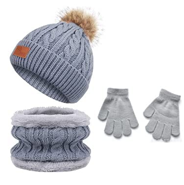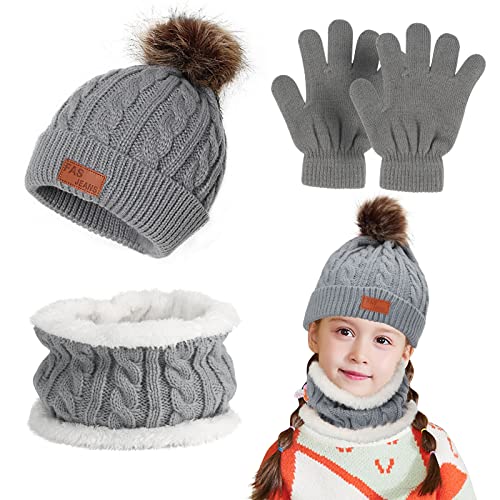 Makone Cappello Sciarpa Guanti per Bambina, Sciarpa in Lana Berretto a Maglia Invernale Antivento Beanie Tenere Caldo Scaldacollo Sciarpa Guanti per Bambino Ragazzo e Ragazza (4-8 Anni), Grigio