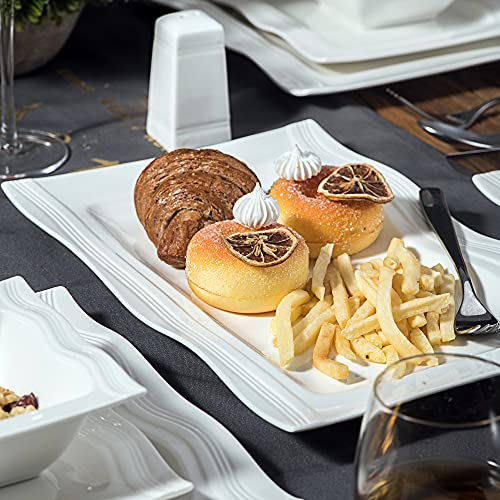 MALACASA, Series Mario, Set di piatti in porcellana bianco con 12 ciotole 12 piatti da dessert, 12 piatti fondi 12 piatti piani e da due coppia spargisale, piatti rettangolari, set per 12 persone