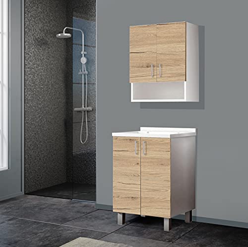 MaMa Store ATENALAV Mobile Lavatoio-Lavapanni Metacrilato con Asse in Legno e gocciolatoio in Alluminio, L.60 x P.50 X H. 86 cm, Bianco Opaco/Quercia Naturale
