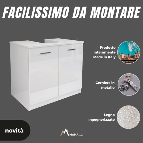 Mama Store Copricolonna Mobile in Kit da Montare Sottolavabo con 2 Ante Bianco Lucido Laccato, L. 70cm x P. 46cm x H.62cm