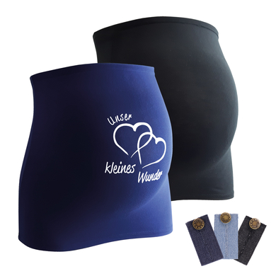 La fascia addominale è un must-have alla moda e allo stesso tempo utile per il guardaroba della gravidanza. L'elastico si estende su top che sono diventati troppo corti durante la gravidanza, in modo che i vostri vestiti preferiti possano essere indossati il più a lungo possibile. Riscalda anche lo stomaco e la schiena. Riceverete due fasce per la pancia, una in nero, l'altra in blu scuro con l'iscrizione della nostra piccola meraviglia, più una confezione da 3 estensioni di jeans. Le estensioni dei jeans vengono consegnate in tre diversi colori di jeans. Dettagli del prodotto: materiale: 93% viscosa, 7% spandex Lavabile fino a 30° C Adatto per essiccatoi Tabella taglie: S = 32-36 M = 38-42 L = 44-48 Un indizio: Il fattore decisivo per la scelta della taglia della fascia addominale è la taglia dei vestiti che si avevano prima della gravidanza. Il materiale delle fasce addominali è elastico e la pancia del bambino in crescita è inclusa.