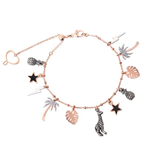 BRACCIALE DI CATENA CON ELEMENTI PENDENTI Bracciale realizzato con catena di argento 925 placcato in oro rosa .Ha undici elementi pendenti che variano per dimensione da 8 a 15 mm realizzati in argento 925. Due ananas ed una giraffa tridimensionali in argento brunito, due palme con chioma glitter, due stelle a cattedrale con smalto nero, due saette in argento e due foglie Monstera con galvanica in oro rosa. La dimensione della circonferenza è regolabile da 18 a 20 cm. Chiusura a moschettone.