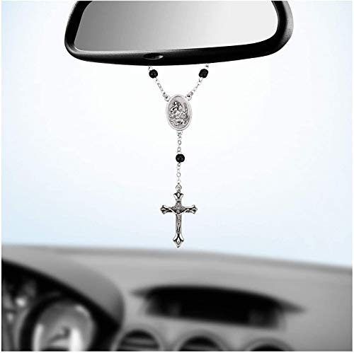 MaMeMi Corona d'auto, nero, con chiusura [lunghezza circa 15 cm] con San Cristoforo & Crocifisso per retrovisore auto/specchietto interno/parasole