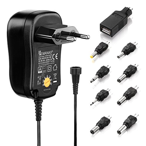 MANAX - 1 Adattatore di rete universale, 3/4,5/6 / 7,5/9 e 12 V AC/DC, 1.000 mA, con 9 connettori e adattatore da viaggio, MX-PS020