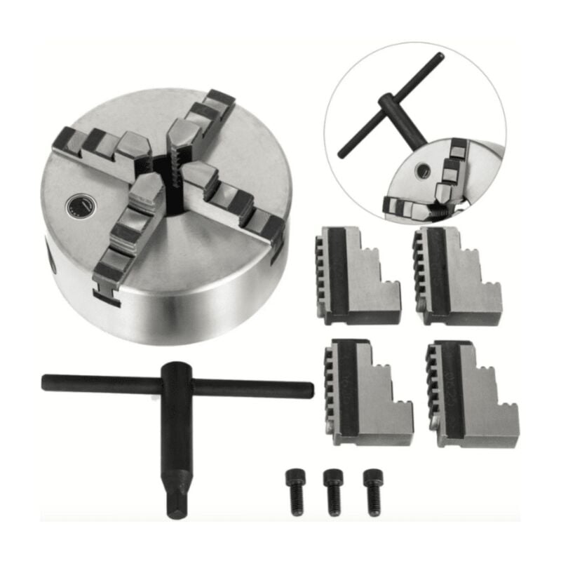Mandrino Ø 130mm professionale autocentrante a 4 ganasce in ghisa indeformabile. Completo di 4+4 griffe in acciaio, temperate, rettificate e reversibili. D= 130mm D1= 100mm D2= 115mm D3(min)= 30mm h(min)= 4mm H1= 84mm H= 60mm d= M8 In dotazione anche una chiave a T. - Dimensioni (cm): 17,4x17,4x15 - Peso con accessori (Kg): 6,2 - Apertura massima (mm): 130