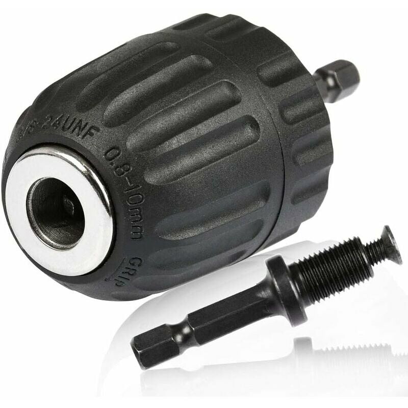 Gambo: 1/4 di pollice. FACILE DA USARE - Basta collegarlo, stringere a mano la punta del trapano standard e il gioco è fatto, pronto per l'uso di punte standard in SDS, fornisce un'eccellente liscia e liscia azione e altro ancora. SUPPORTO FORTE - Con cuscinetto reggispinta unico, design delicato, per una presa forte semplicemente serrando il mandrino, stretto e stabile. NOTA: il prodotto NON può essere utilizzato Antiorario! NON adatto per generatori di impatto o applicazioni che comportano un carico di coppia elevato. Mandrino per trapano senza chiave con capacità di 0,8-10 mm con strumento di conversione dell'azionamento con codolo esagonale da 1/4 di pollice;
