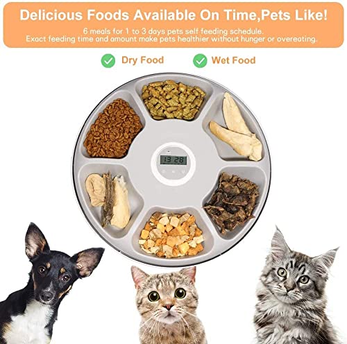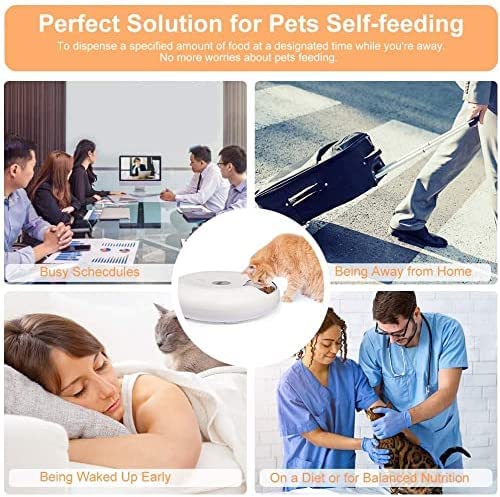 Alimentazione fino a 6 animali domestici: la mangiatoia automatica preprogrammabile dispone di un timer integrato e diverse aree che consentono di nutrire gli animali domestici fino a 6 pasti al giorno, controllare le loro dimensioni della porzione e creare un orario completo per i piani di alimentazione giornalieri.