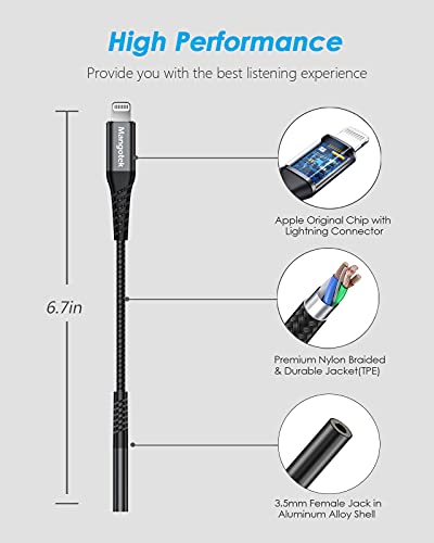 【Certificato MFi】 Adattatore jack Mangotek da Lightning a cuffie da 3,5 mm certificato da Apple MFi, con la certificazione Apple MFi e i nostri severi test di qualità garantiscono qualità e compatibilità e sono collegati in modo sicuro con i tuoi dispositivi Apple. NOTA: Supporta solo cuffie certificate MFi, non può garantire che le funzioni funzionino normalmente se le cuffie non sono certificate MFi.