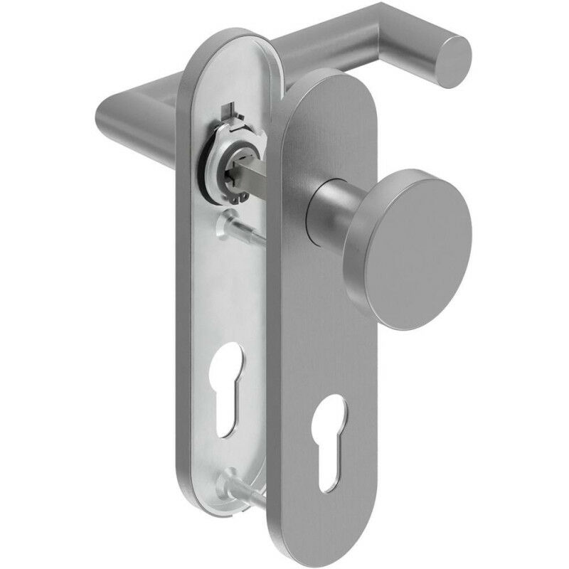 FS set maniglia a leva BASE-4 8907. acciaio inox - Forma a L con ritorno - Per porte tagliafuoco e tagliafumo - In acciaio inox. opaco - Con molle di fissaggio - Utilizzabile a destra/sinistra. Non per set intercambiabili - Cuscinetto fisso (premontato in fabbrica) - Camme di supporto estese sulle parti inferiori - Sottostruttura in acciaio - Avvitamento attraverso la porta - Cuscinetto liscio esente da manutenzione - Per porte interne. Materiale legno. Acciaio - Categoria d'uso DIN EN 1634-1: Prove di resistenza al fuoco per porte DIN 18273: Set di maniglie a leva - Opzionale con perno spaccato FS-120 da ordinare separatamente. DIN EN 179: Serrature per uscite di emergenza con maniglia a leva - Classificazione chiave 4 7 - B1 1 4 O A/B - Materiale di fissaggio incluso.